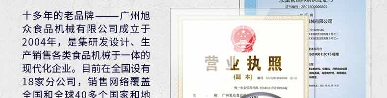 廣州旭眾食品機(jī)械有限公司是一家集科研開(kāi)發(fā),生產(chǎn)設(shè)計(jì),營(yíng)銷服務(wù)為一體的現(xiàn)代化生產(chǎn)企業(yè)。現(xiàn)代化生產(chǎn)車間,精湛制造技術(shù),所產(chǎn)機(jī)械歷經(jīng)市場(chǎng)重重考驗(yàn),不斷贏得海內(nèi)外客戶的贊譽(yù)。