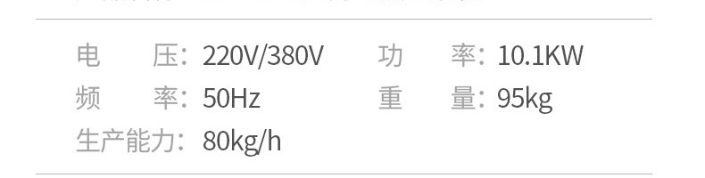名稱ET-YL-09壓力電熱豆?jié){機(jī) 電源220V/380V 功率10.1KW 產(chǎn)量80kg/h 尺寸980X500X1350mm 重量95kg 規(guī)格聯(lián)系銷售員 其他頻率:50Hz