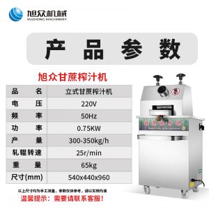 名稱立式甘蔗機 電源220V/50Hz 功率0.75kw 產(chǎn)量300-350kg/h 尺寸外形尺寸540*440*960mm 重量65kg 規(guī)格 其他