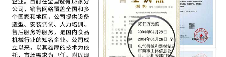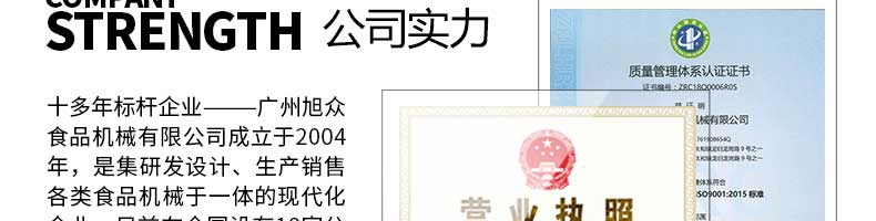 廣州旭眾食品機(jī)械有限公司是一家集科研開(kāi)發(fā),生產(chǎn)設(shè)計(jì),營(yíng)銷(xiāo)服務(wù)為一體的現(xiàn)代化生產(chǎn)企業(yè)?,F(xiàn)代化生產(chǎn)車(chē)間,精湛制造技術(shù),所產(chǎn)機(jī)械歷經(jīng)市場(chǎng)重重考驗(yàn),不斷贏得海內(nèi)外客戶的贊譽(yù)。