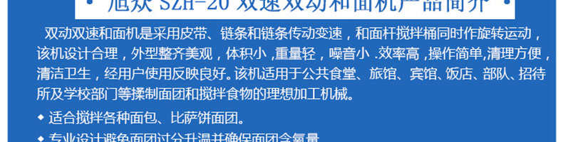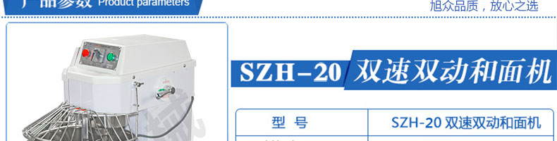 SZH-20型雙速雙動和面機,本機適合攪拌各種面包、包子、饅頭、湯圓、披薩餅面團,專業(yè)設(shè)計避免面團過分升溫并確保面團含氧量。過載、缺相保護裝置,防護罩安全連動裝置。