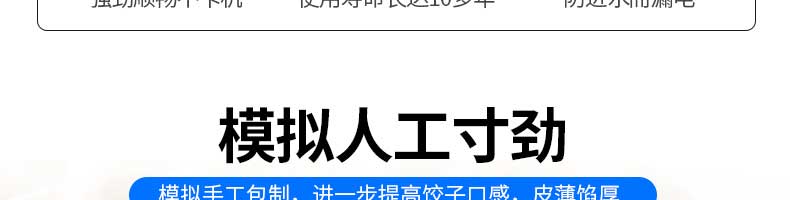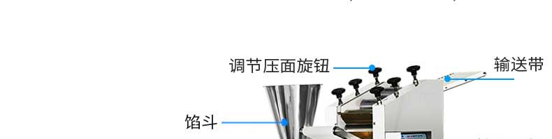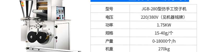名稱JGB-360仿手工餃子機 電源220/380v 功率1.75kw 產(chǎn)量0-24000個/h 尺寸3680*820*1450mm 重量450kg 規(guī)格12-38g/個 其他