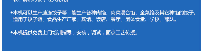 JGB-180餃子機(jī),先進(jìn)的自動(dòng)餃子生產(chǎn)設(shè)備,包括主動(dòng)壓皮部分、自動(dòng)供餡部分、自動(dòng)包合部分、自動(dòng)成品輸送部分,并且只要更換模具,就可制鍋貼等食品。適合食品速凍廠、飯店、廠礦學(xué)校食堂等制作包餡面制品單位使用。