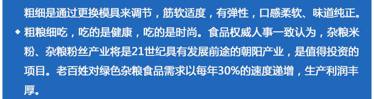 SZ-400多功能米粉機(jī),生產(chǎn)多樣性可生產(chǎn)米粉、米線、粉絲、粉條、、年糕、玉米面條、各種雜糧粉絲、各種面條、雜糧面條、彩色面條以及以紅薯、玉米、大豆、蠶豆等制成淀粉為原料的等多種食品而且每種食品厚薄、粗細(xì)等規(guī)格可根據(jù)需要任意調(diào)整。