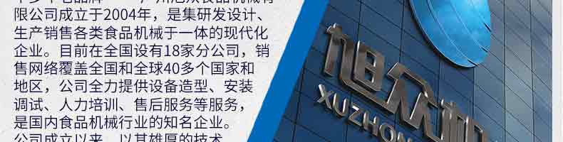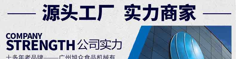 廣州旭眾食品機械有限公司是一家集科研開發(fā),生產設計,營銷服務為一體的現(xiàn)代化生產企業(yè)?,F(xiàn)代化生產車間,精湛制造技術,所產機械歷經(jīng)市場重重考驗,不斷贏得海內外客戶的贊譽。