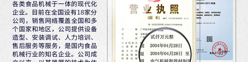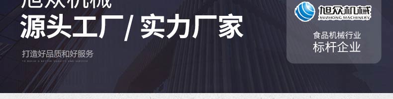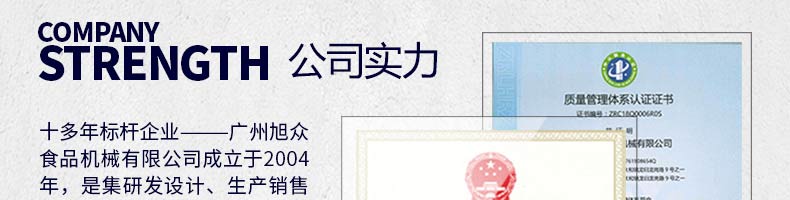 廣州旭眾食品機械有限公司是一家集科研開發(fā),生產(chǎn)設(shè)計,營銷服務(wù)為一體的現(xiàn)代化生產(chǎn)企業(yè)?,F(xiàn)代化生產(chǎn)車間,精湛制造技術(shù),所產(chǎn)機械歷經(jīng)市場重重考驗,不斷贏得海內(nèi)外客戶的贊譽。