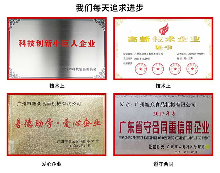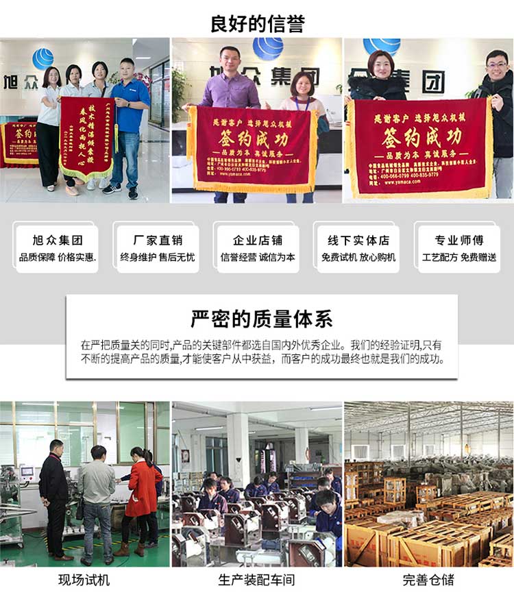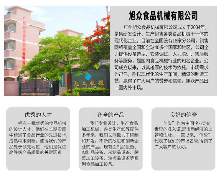 廣州旭眾食品機械有限公司是一家集科研開發(fā),生產(chǎn)設計,營銷服務為一體的現(xiàn)代化生產(chǎn)企業(yè)。現(xiàn)代化生產(chǎn)車間,精湛制造技術,所產(chǎn)機械歷經(jīng)市場重重考驗,不斷贏得海內(nèi)外客戶的贊譽。