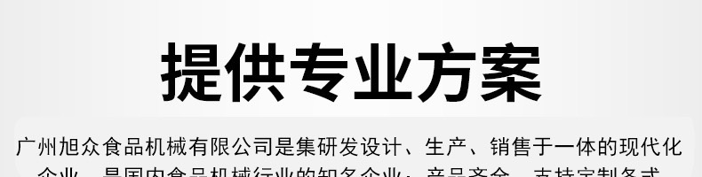 廣州旭眾食品機(jī)械有限公司是一家集科研開發(fā),生產(chǎn)設(shè)計(jì),營(yíng)銷服務(wù)為一體的現(xiàn)代化生產(chǎn)企業(yè)?,F(xiàn)代化生產(chǎn)車間,精湛制造技術(shù),所產(chǎn)機(jī)械歷經(jīng)市場(chǎng)重重考驗(yàn),不斷贏得海內(nèi)外客戶的贊譽(yù)。