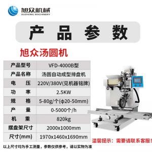 VFD-4000B湯圓機,定量準確自動搓圓排盤成型大小均勻口感柔滑。可制作各式包餡食品,如湯圓、芝麻球、豆沙包、南瓜餅、奶黃包等