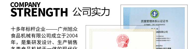 廣州旭眾食品機械有限公司是一家集科研開發(fā),生產(chǎn)設(shè)計,營銷服務(wù)為一體的現(xiàn)代化生產(chǎn)企業(yè)?,F(xiàn)代化生產(chǎn)車間,精湛制造技術(shù),所產(chǎn)機械歷經(jīng)市場重重考驗,不斷贏得海內(nèi)外客戶的贊譽。